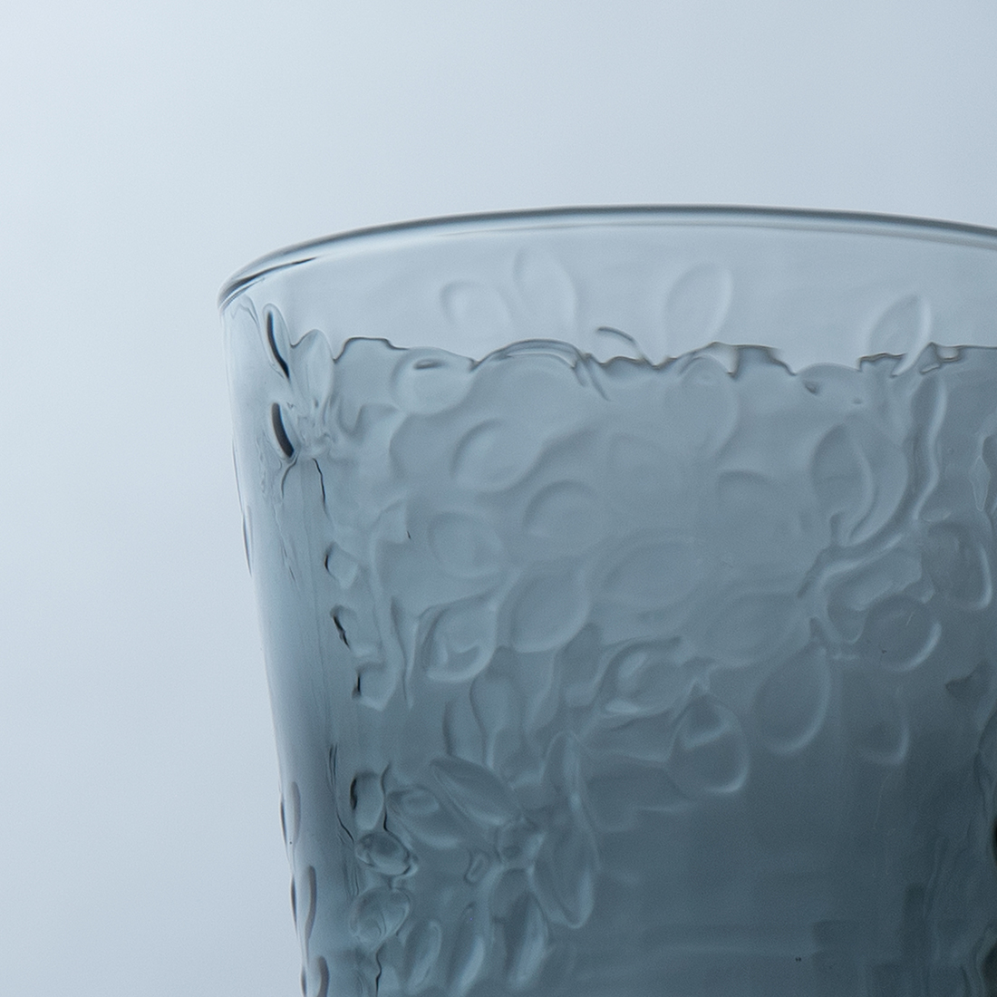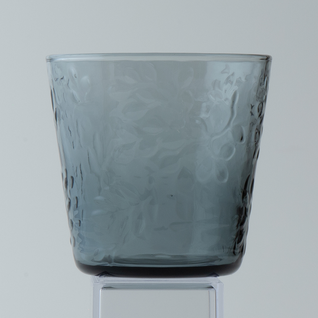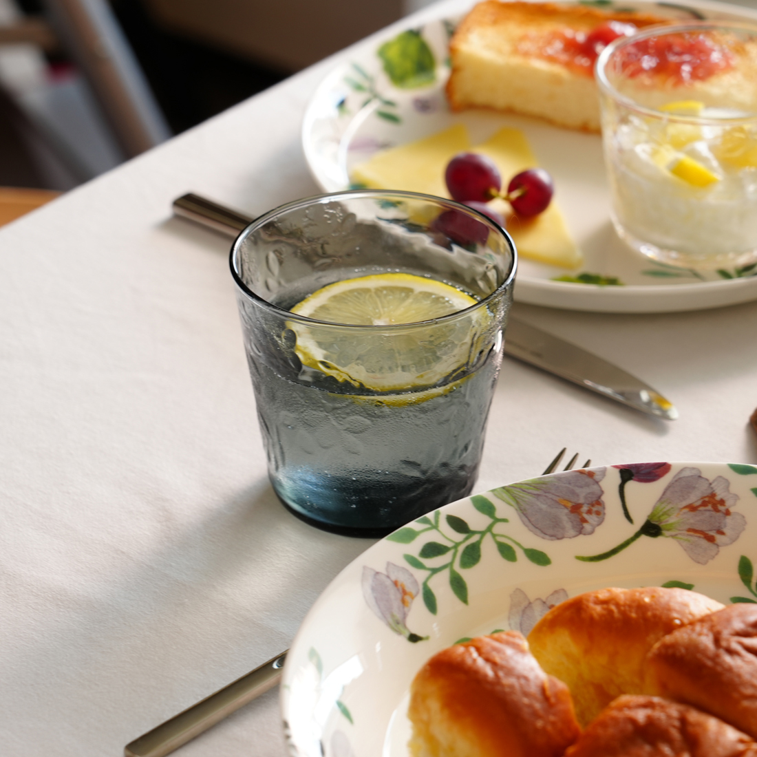 グラスにはアンナの作品『Midsummer Meadow』(真夏の牧草地)をレリーフにして配置し、可愛らしい仕上がりにしました。秋に向けてセレクトしたシックでモードなグレー色はコーディネートの幅を広げてくれます。