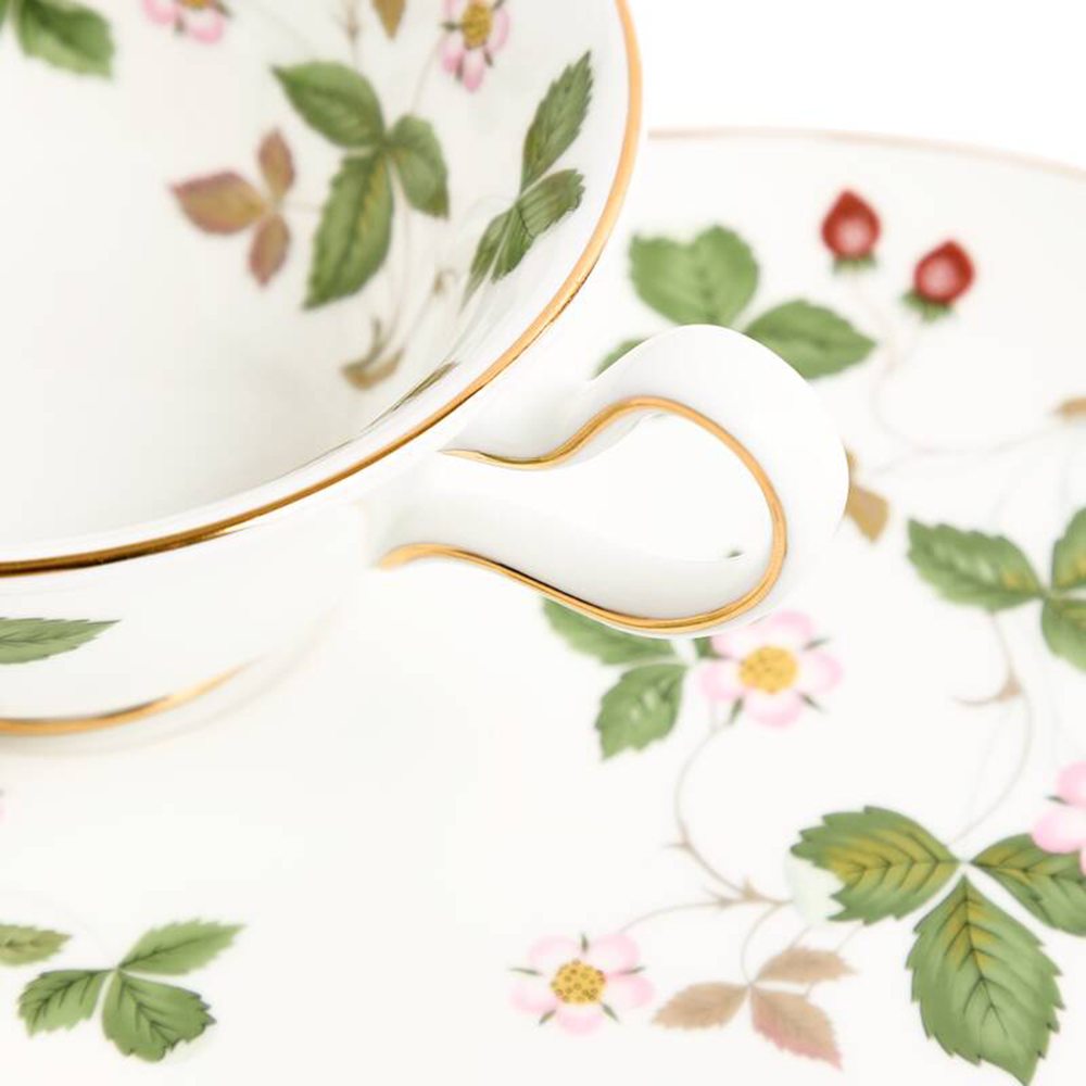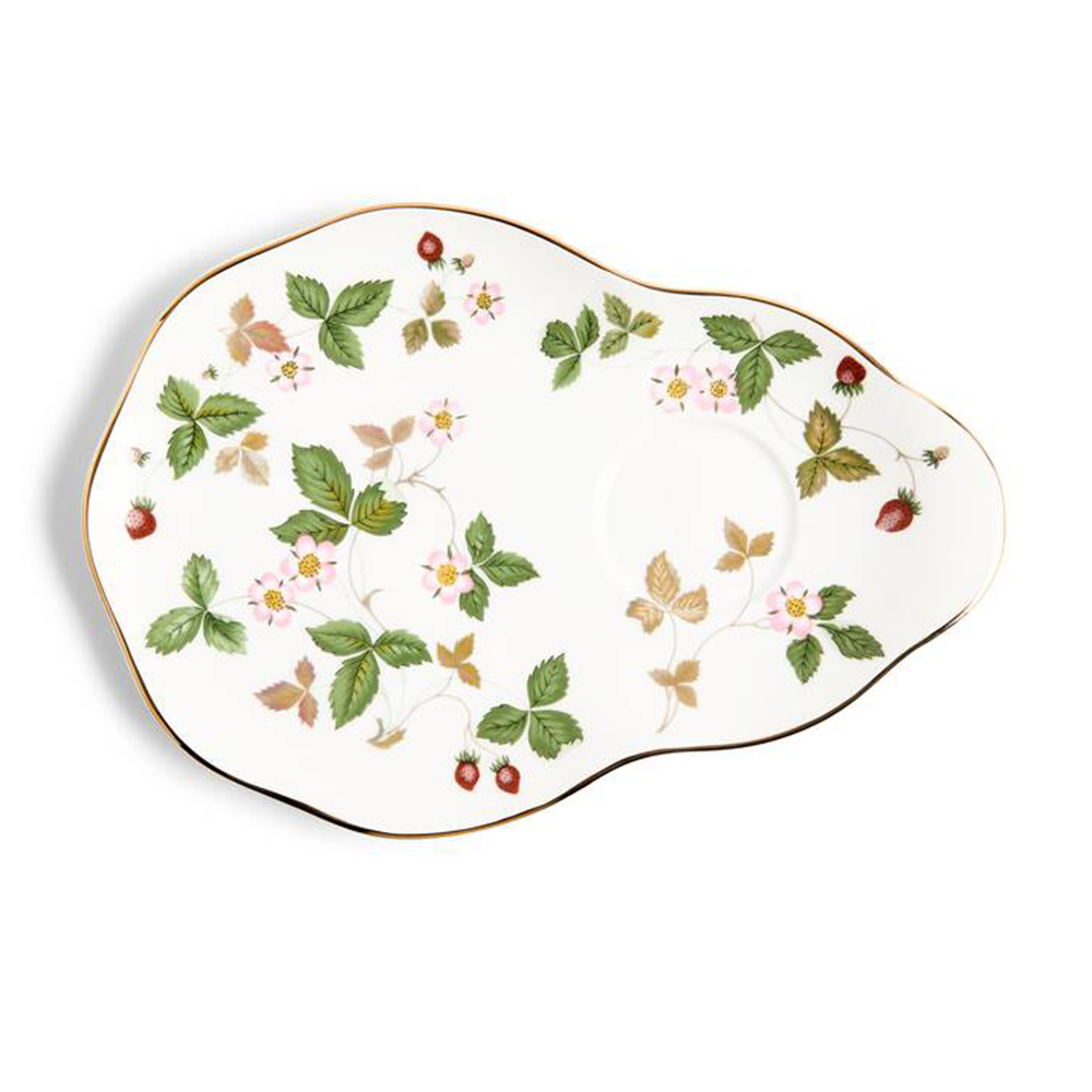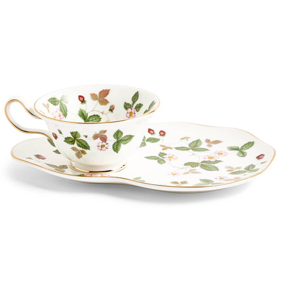 ティータイムセットは、「ワイルドストロベリー」50周年に際に限定発売されたものを再生産しました。プチスイーツなどをのせられる変形ソーサーとカップの華やかなセットです。
