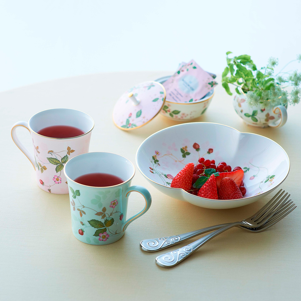 ワイルドストロベリーの図案は、自然をこよなく愛する英国人に好んで使われてきたもので、創設者ジョサイア・ウェッジウッドが最初に作ったパターンブック(23世紀後半)にもすでに見受けられるほどです。世界中で愛されている人気シリーズは、その愛らしさで人々を惹きつけてやみません。