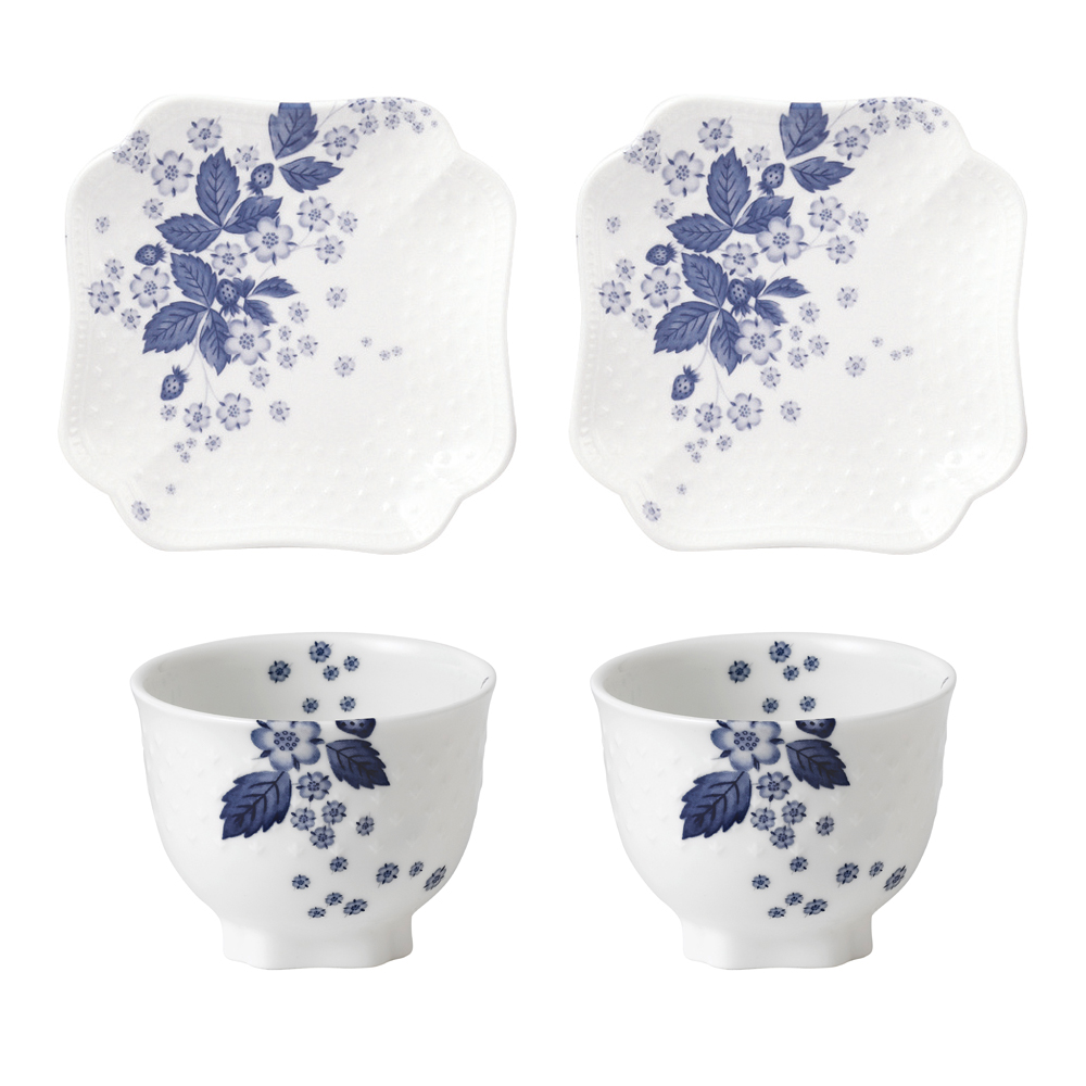「ストロベリー ブルーム インディゴ」は、ファイン ボーン チャイナの優美な乳白色に藍色(インディゴ)で描かれた野苺柄が上品なシリーズです。お二人で楽しむティータイムにぜひ。