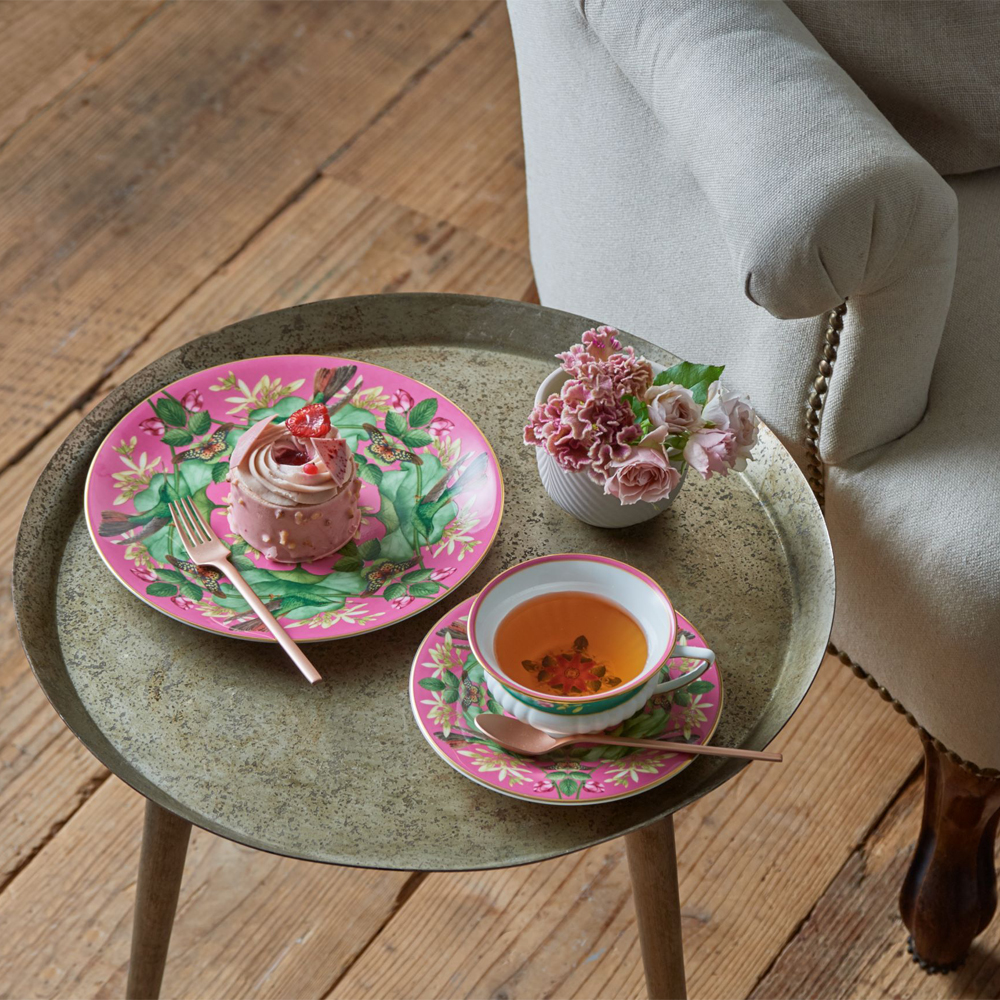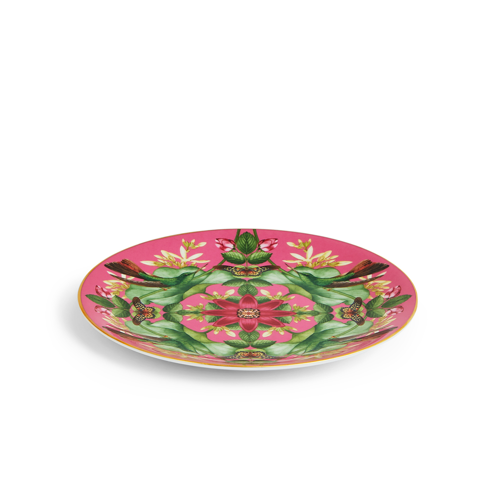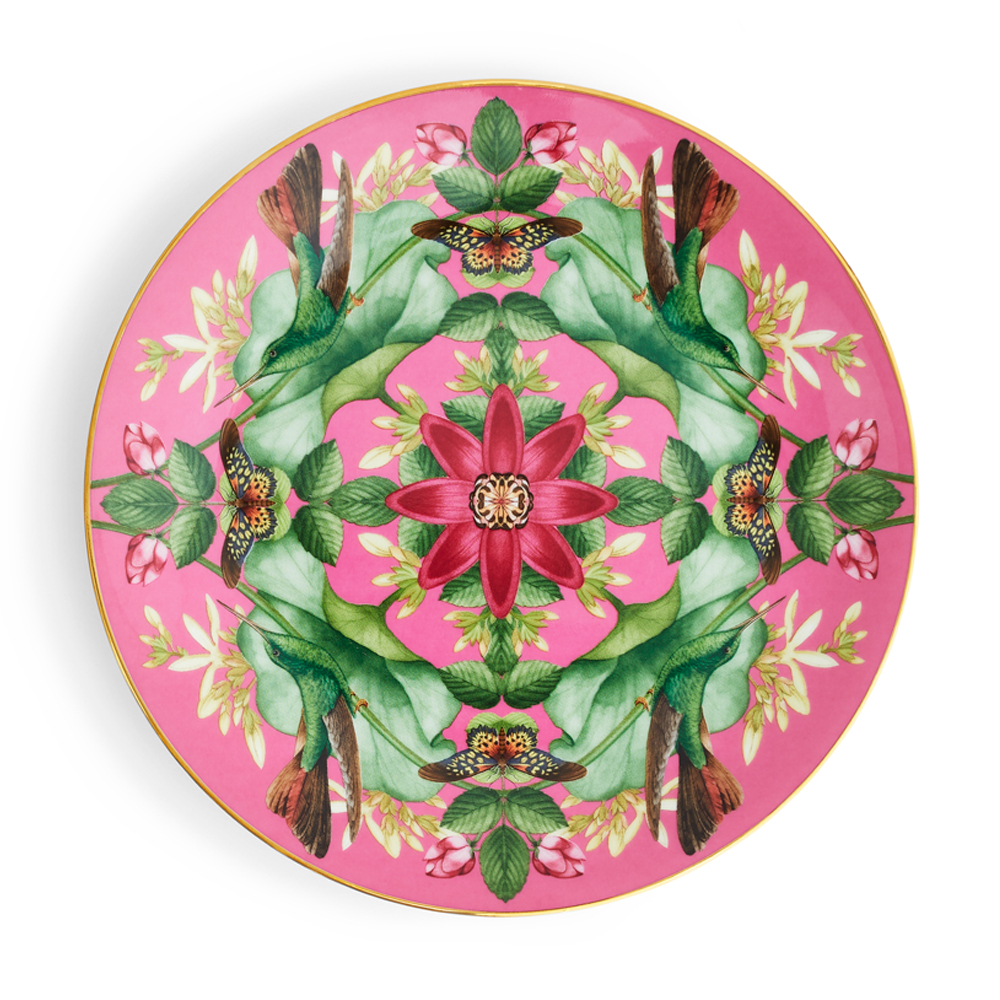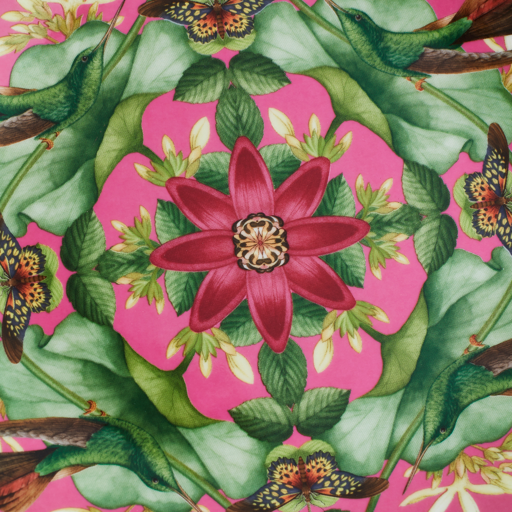 知恵と知識の発展、そしてアジアの熱帯地方では、神聖の象徴とされるピンクの睡蓮。大きな花から広がる華やかな香りに、鳥や蝶が集う姿が描かれています。