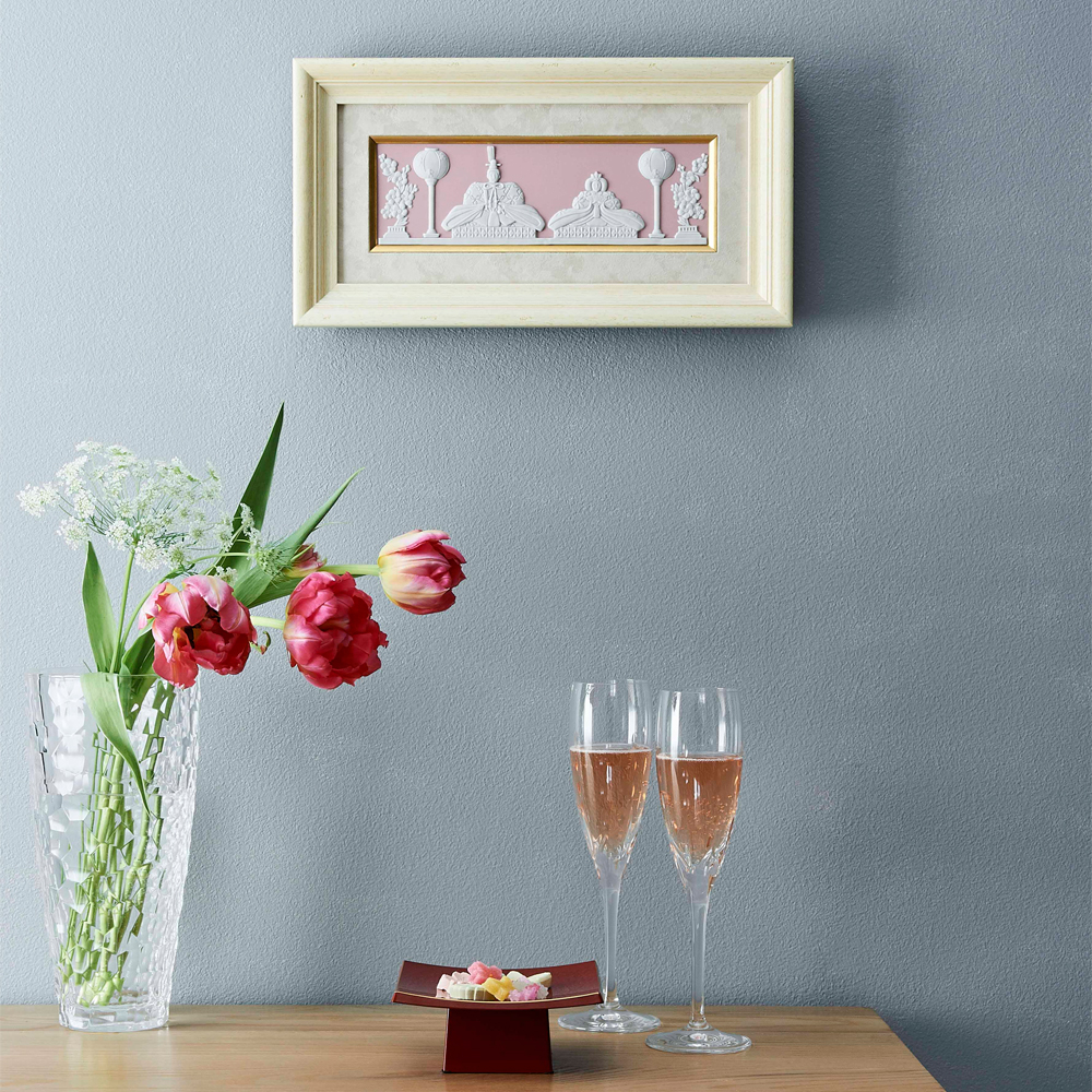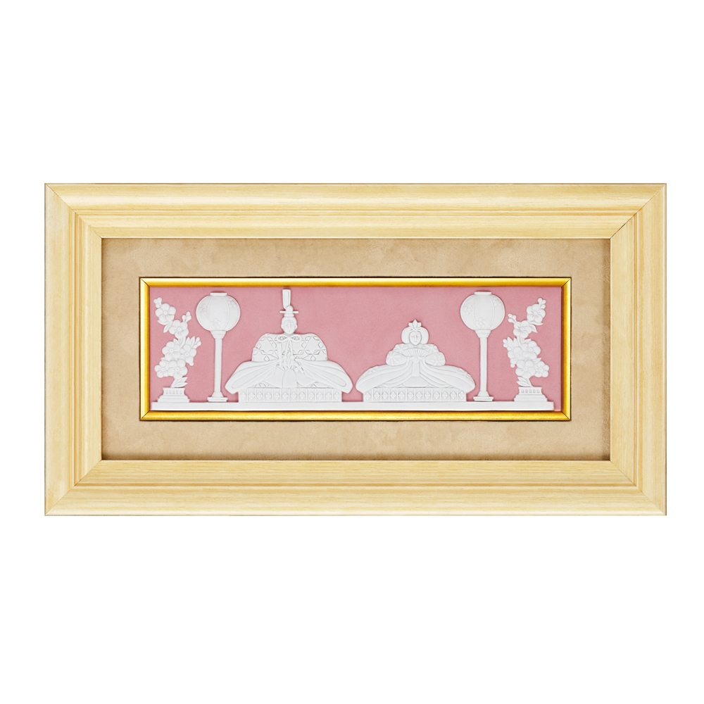 清楚で可憐な雰囲気のお内裏様とお雛様に、春の訪れを告げる桃の花をモチーフとしてあしらった「ジャスパー雛(ひな)ドールプラーク」。愛らしいデザインと場所をとらずに飾っていただける手軽さが魅力です。女の子の節句らしいピンクジャスパーと高級感のあるすっきりとした木製フレームが、ご自宅での雛祭りを素敵に演出します。
