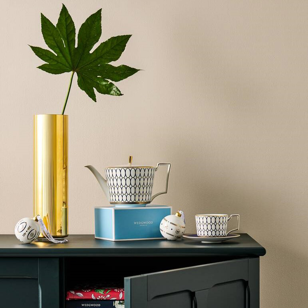 日本初登場のルネッサンスゴールドのオーナメント 。 ウェッジウッド創業時のネオ ・ クラシカルスタイルを現代風に再生したデザインからジャスパーカメオをモチーフとするオーバル 楕円 やローレル模様がアレンジされています。柄違いの2個セットです 。