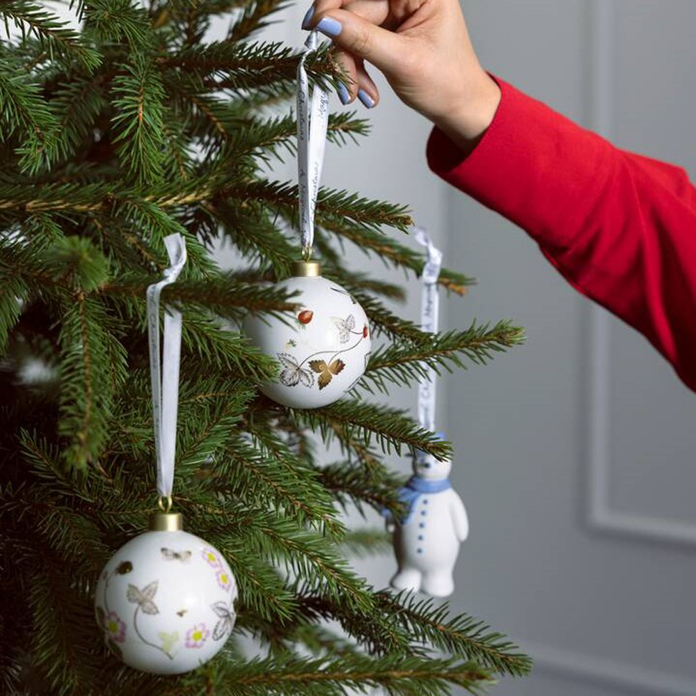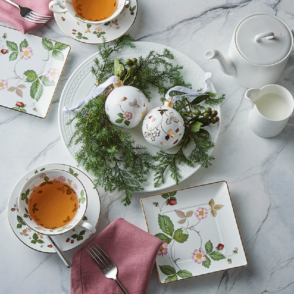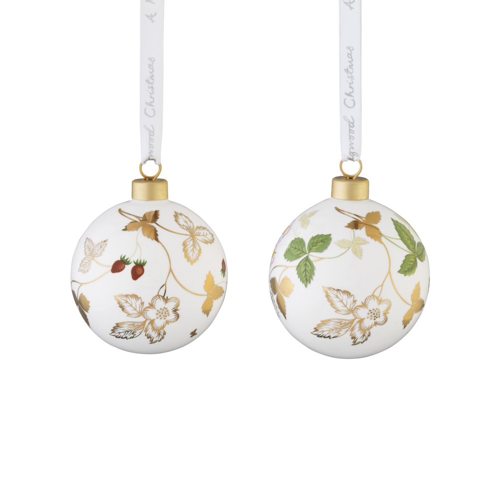 ウェッジウッドの人気パターンの一つ、ワイルドストロベリーのオーナメント。異なるパーツを切りとった、柄違いのオーナメント2個セットです。クリスマスツリーに飾っても、テーブルを飾るオーナメントとしても。