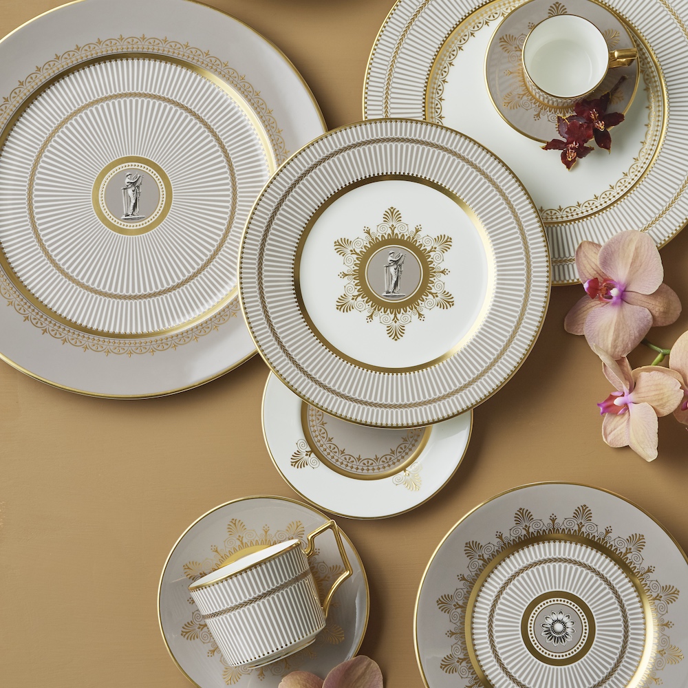 上品な金彩色と温かみのあるグレージュカラー。ウェッジウッドのネオクラシック・スタイルの象徴的要素「アンセミオン」「コロネード」「ローレル(月桂樹)」「カメオ」などのモチーフが取り入れられています。家時間の楽しみ方を知った今、日常使いの贅沢な食器を。