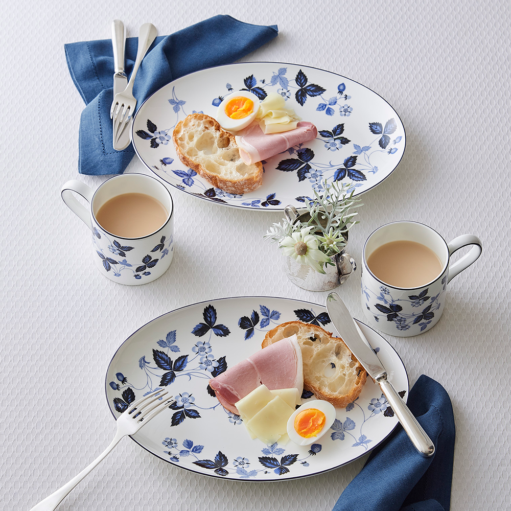 生き生きとした蔓、ふっくらとしたイチゴ、そして華やかなゴールドの縁という、いかにも英国らしいデザインが特徴です。このアイコニックなパターンが、深いインクブルーで現代向けにアップデートされたのが新デザイン「ストロベリー インクブルー」です。
