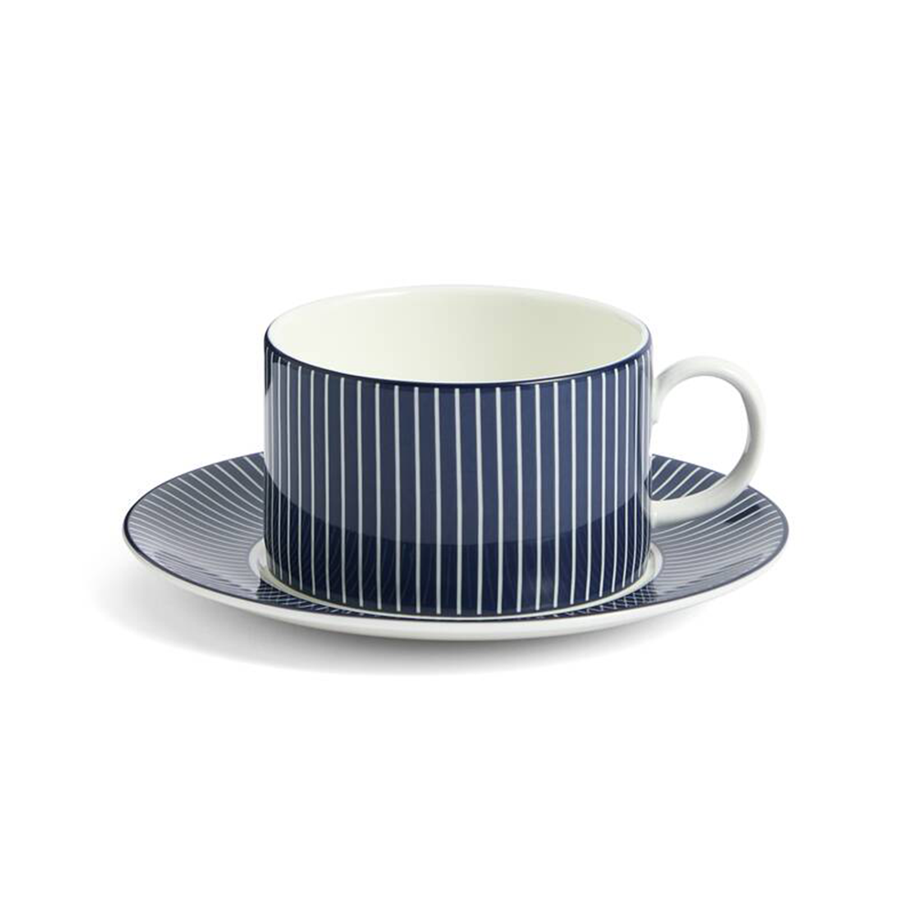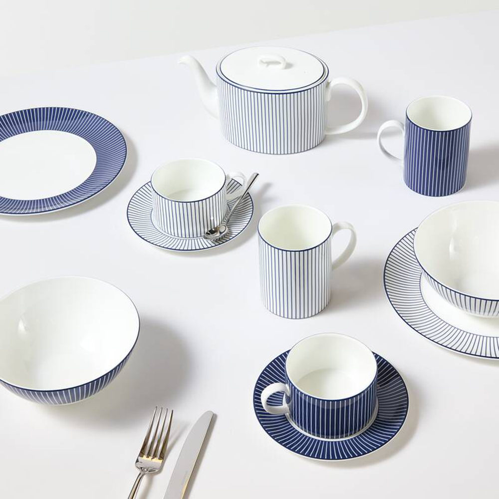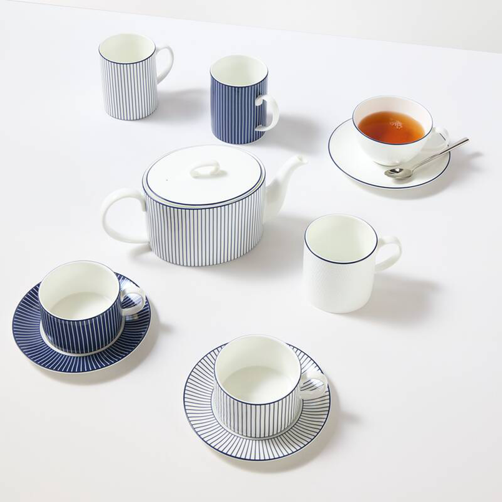 - ジオ ブルー(ピンストライプ)コレクションは、ウェッジウッドの18世紀のアーカイブの中から、エンジンターン技法で制作されたブラックバサルトにインスピレーションを得てデザインされており、ジャスパーパンサーベースのなどの作品に見られる、エンジンターンで作り出すストライプ デザインを彷彿とさせます。深みのあるブルーはポートランドブルージャスパーに着想を得た色で、洗練されつつも心地よいダイニングを演出します。また、ピンストライプは、ジョージアンスタイルの建築に見受けられるフルーテッド(縦溝柄)にも通じ、スーツなどにも用いられる英国らしいモチーフでもあります。縁には、ブルーのハンドライニングが施され、印象を引き締めています。