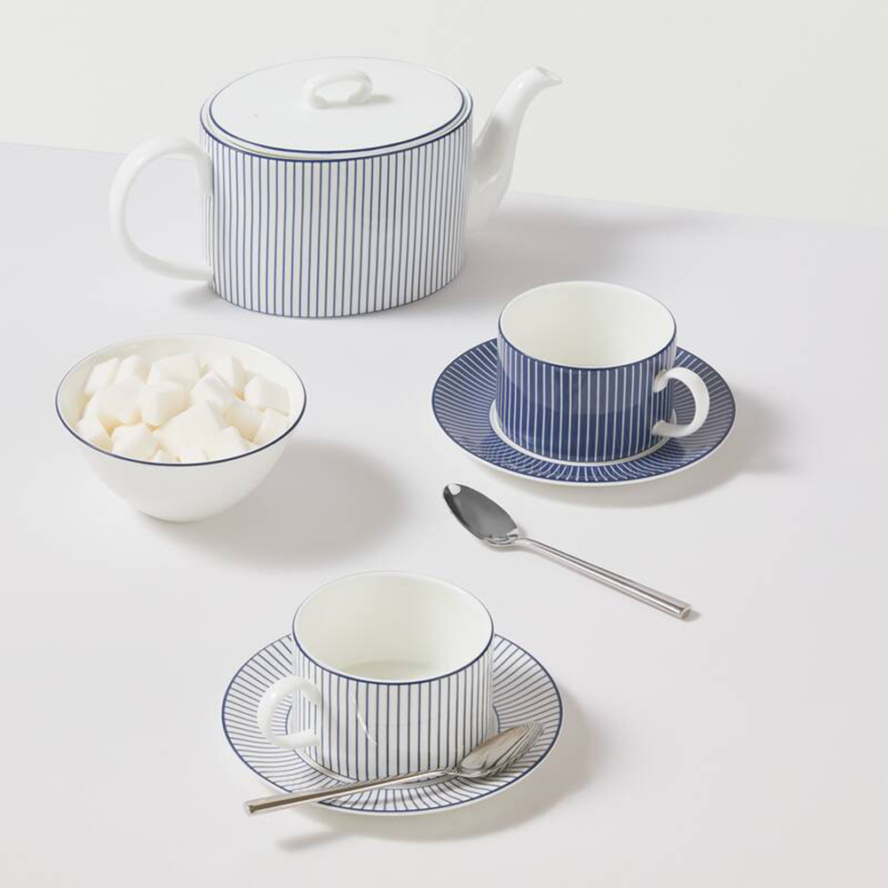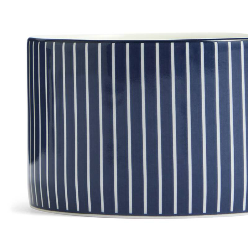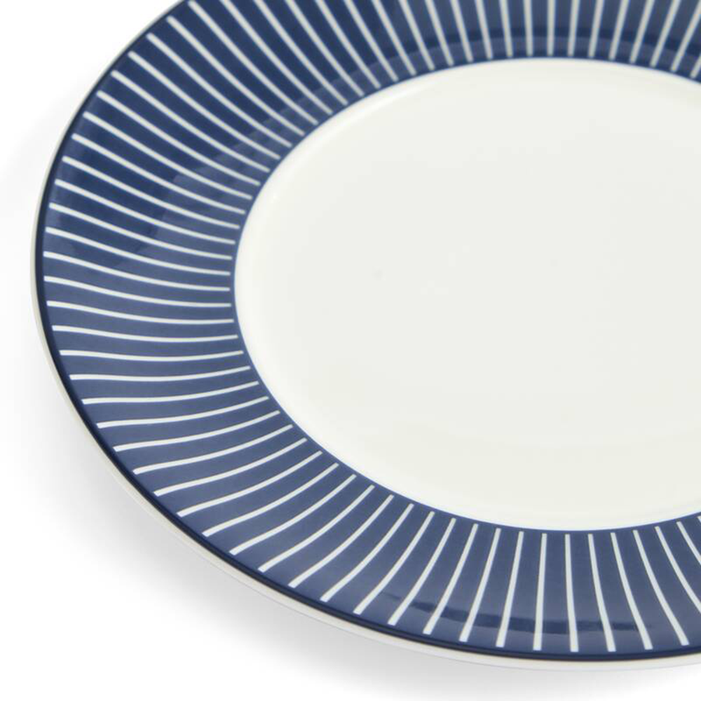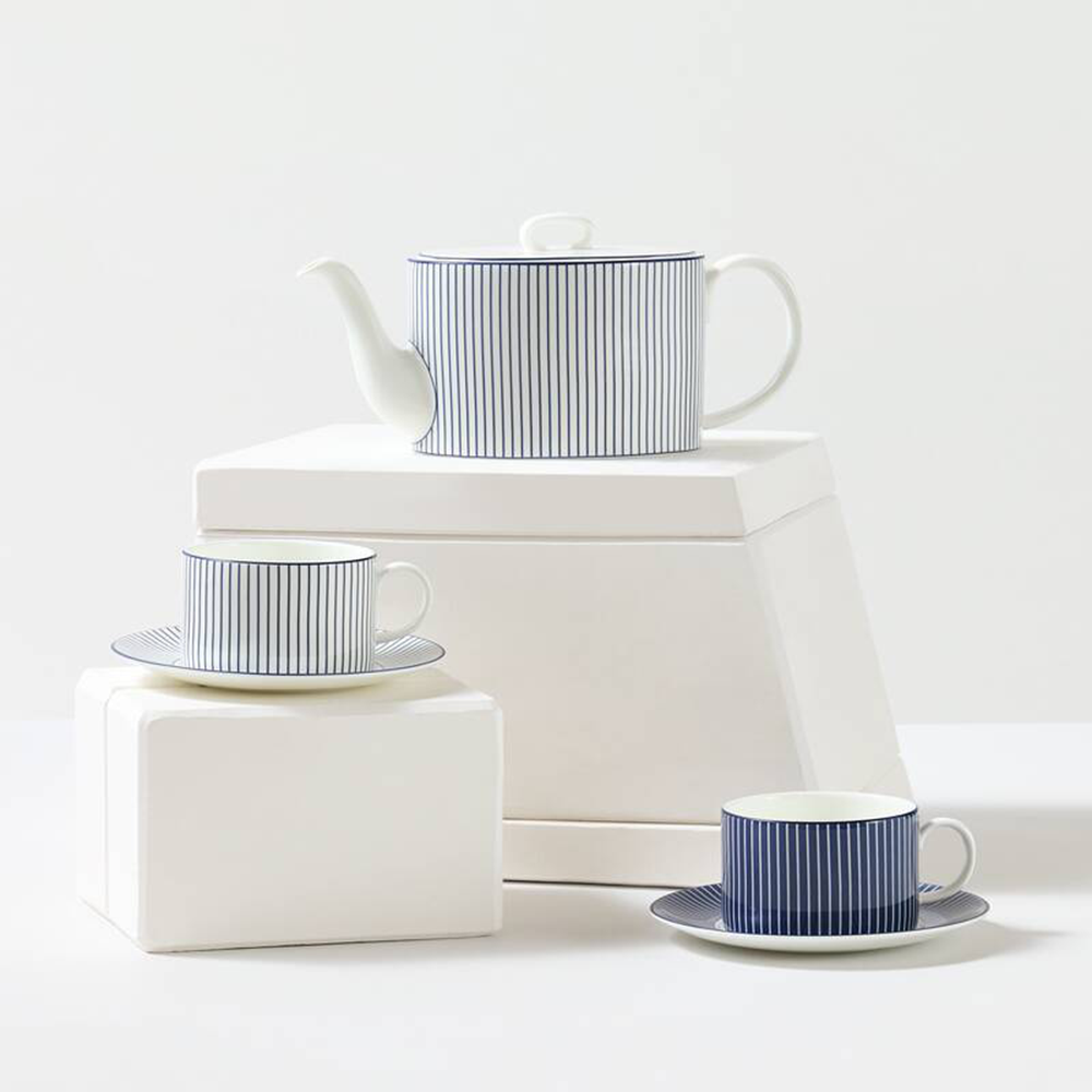 - ジオ ブルー(ピンストライプ)コレクションは、ウェッジウッドの18世紀のアーカイブの中から、エンジンターン技法で制作されたブラックバサルトにインスピレーションを得てデザインされており、ジャスパーパンサーベースのなどの作品に見られる、エンジンターンで作り出すストライプ デザインを彷彿とさせます。深みのあるブルーはポートランドブルージャスパーに着想を得た色で、洗練されつつも心地よいダイニングを演出します。また、ピンストライプは、ジョージアンスタイルの建築に見受けられるフルーテッド(縦溝柄)にも通じ、スーツなどにも用いられる英国らしいモチーフでもあります。縁には、ブルーのハンドライニングが施され、印象を引き締めています。
